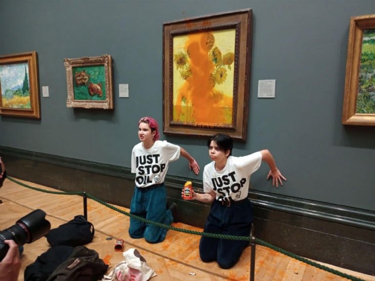 Manifestantes ecologistas arrojaron sopa de tomate sobre el famoso cuadro «Los girasoles» de Vincent van Gogh el viernes en la National Gallery de Londres, para exigir al gobierno británico que ponga fin a los nuevos proyectos de extracción de gas y petróleo.