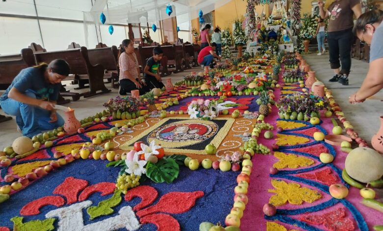 La alfombra en la capilla de San José, de poco más de tres metros de largo, muestra la imagen del Corazón de Jesús, una cruz y una flor, y adorna la imagen de la Virgen con frutas y arreglos florales.