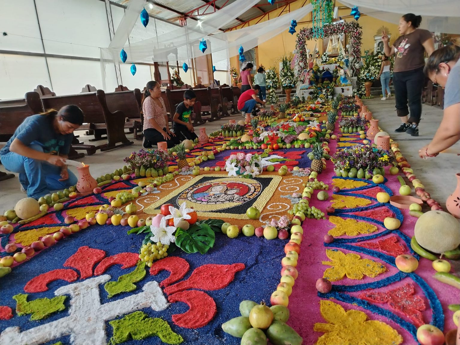En el marco de la celebración de la Asunción de María, el municipio de Huaquechula ha colocado su tradicional alfombra de fruta y aserrín. Los encargados y voluntarios realizaron esta alfombra en la capilla de San José, con motivo de conmemorar el tránsito de la Virgen María, que se celebra el 15 de agosto.