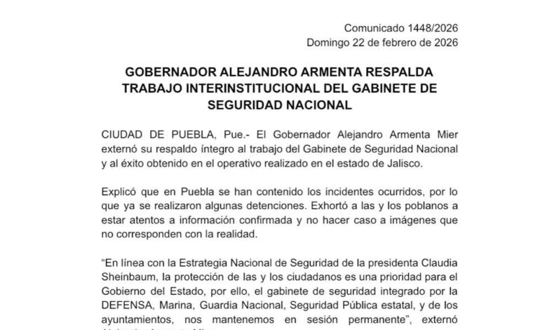 El gobernador Alejandro Armenta Mier manifestó su respaldo al trabajo del Gabinete de Seguridad Nacional, al destacar los resultados de los operativos coordinados en el estado de Jalisco y la contención de incidentes en Puebla.