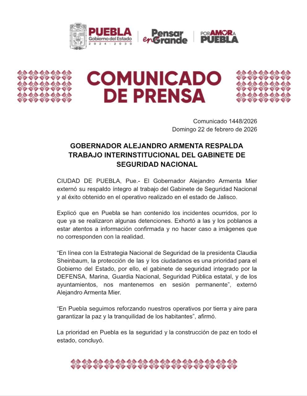 El gobernador Alejandro Armenta Mier manifestó su respaldo al trabajo del Gabinete de Seguridad Nacional, al destacar los resultados de los operativos coordinados en el estado de Jalisco y la contención de incidentes en Puebla.