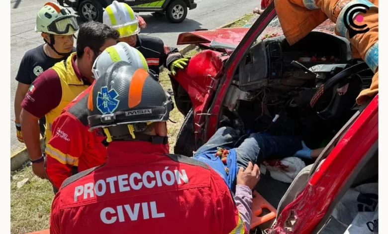 Debido al impacto, el conductor de la unidad cargada con flor de muerto en Puebla quedó prensado de las piernas entre los fierros y cables del automóvil.